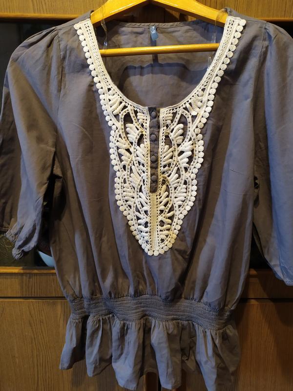 Суперлегка літня бавовняна блузочка кольору мокко. Оздоблена спереду натуральним фактурним мереживом молочного кольору, по якому є вишивка бісером ( не обтяжує). Рукавчики - 2/3, на резинці, що дозволяє змінювати довжину. Приблизно по лінії талії - резинка у кілька рядів. Усі ці деталі додають романтичності блузці. Розмір вказаний 16 (44). Заміри: пог - 56, довжина по спинці - 66, до резинки - 50-51 см, довжина рукава -42 см. Вироблено в Індії. Склад - 100% бавовна.