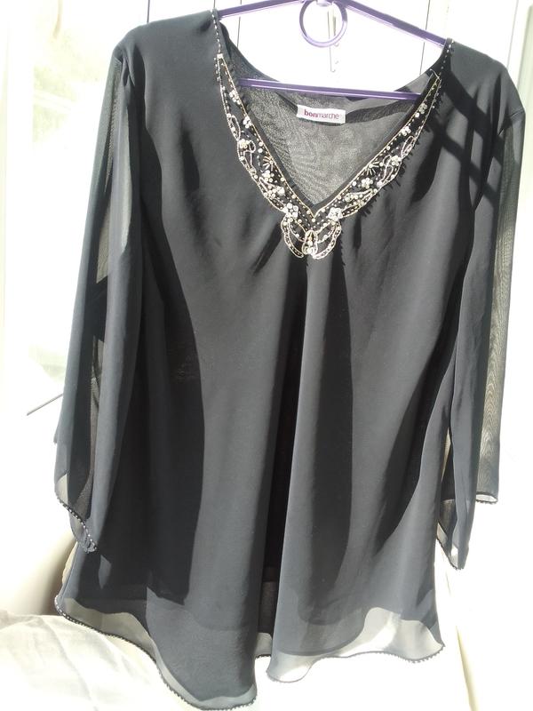 Красивая нарядная прямая блузка из шифона на шифоновой подкладке не светится. Рукав просвечивает. На фото она вышла серая, но вживую она черная.Замеры:ОГ-148см. низ кофты -152см длина рукава -47см.