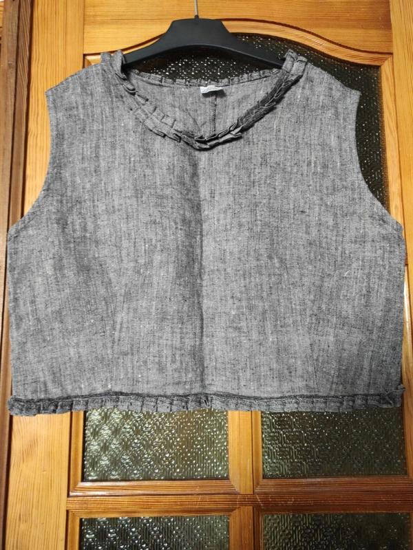Топ из 100% льна, сбоку на молнии. Размер написан М, на наш 44-48. Длина 45 см, ширина плеч 42, ПОГ 52, низ 48 см, не тянется. Состояние идеальное. Цвет серый меланж.