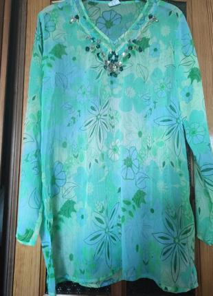 Блуза, туника, хороша и как пляжный вариант. Ткань полупрозрачная, шифон, вверху украшена паетками, бисером и камнями. Цвет салатовый и голубой в растительный принт. Размер написан 40/42, наш 44-48. Длина 80 см, длина рукава 60 см, ширина плеч 42-44 см, ПОГ 55, низ 55 см. Прямой покрой. Без каких либо дефектов.