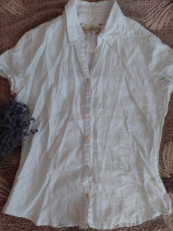 лляна рубашечка білого кольру. розмір пише 38. є маленькиий дифект на останньму фото показвла але його невидно. дуже ленька та зручна