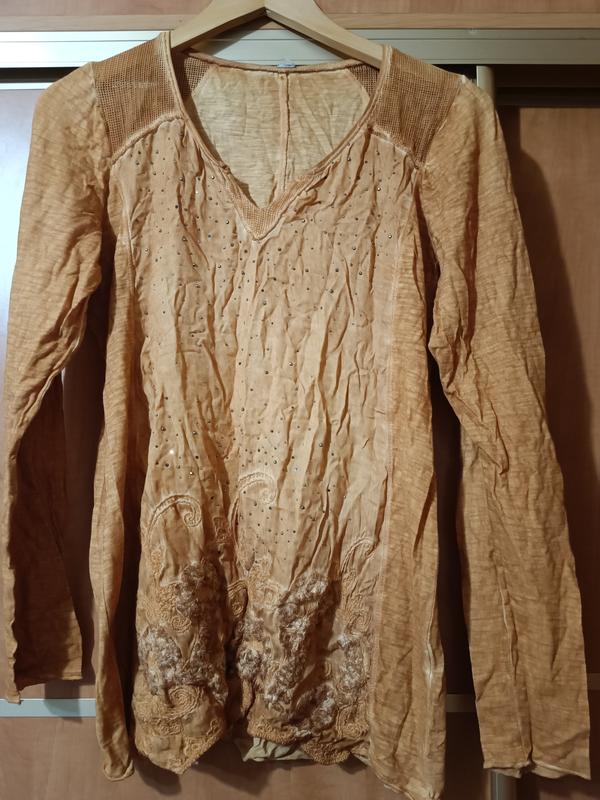 блуза комбинация натуральных тканей лёгкий каттон и трикотаж тонкий, верх плечиков спереди сеточка, стразы, цвет как на фото, бирочек нет, по низу цветы