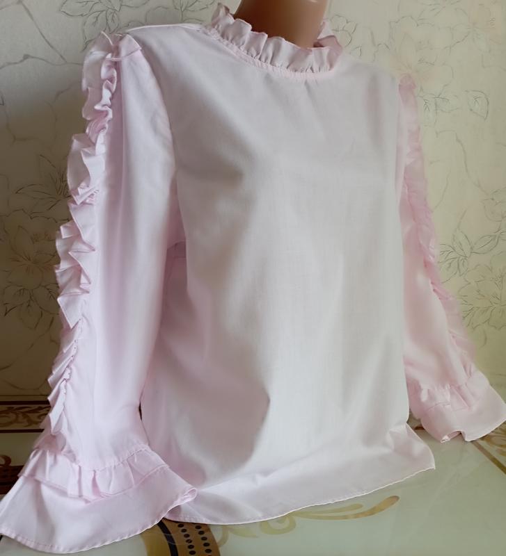 Фирменная блуза с рюшами нежно-розового цвета, плечи 38, ПІГ 52, ПИТ 52, рукав 50, длина изделия 60. Бирки срезаны, на ощупь хлопок+полиэстер.