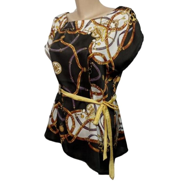 Нарядная блуза с принтом цепей, под поясочек. Линия плеча спущена. Ткань мягкая, приятная на ощупь. 🌼 ПОГ 55 🌼 ПОТ 46 🌼 по низу 52 🌼 длина с левой стороны 67 🌼 длина с правой стороны 59 Сток, новое. Бирка о составе ткани отсутствует, предполагаю - полиэстер.