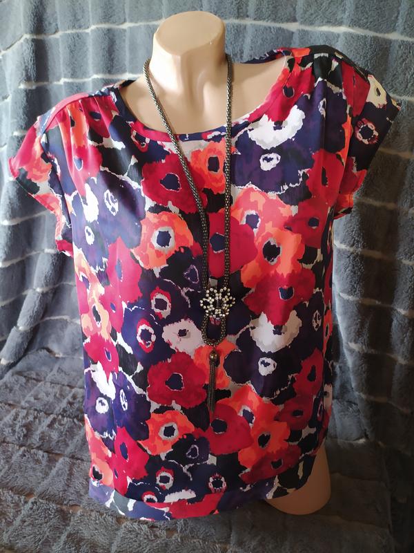 Яскрава блуза у квітковий принт. Матеріал схожий на атлас, у літню спеку подарує відчуття прохолоди. Орієнтовно розмір 48-50, беріть до уваги заміри (вказані на фото).