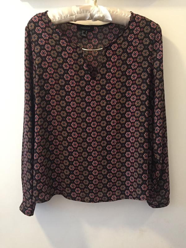 Блуза с красивейшим принтом и декором в виде чекера Длина 58, пог 50, пот 56, поб 60( трапециевидная модель), плечо 8, длина рукава 60