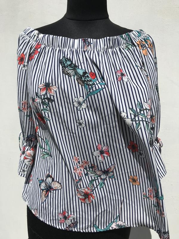 Голубая блузка с цветочным принтом создаст расслабленный образ для летних прогулок. Модель выполнена из тонкого хлопкового текстиля. Свободный крой скрывает силуэт, позволяя чувствовать комфорт. Вырез с резинкой открывает плечи. Рукава ¾ дополнены завязками. Длина 52 см ПОГ 56 см ПОТ 56 см Рукав 44 см