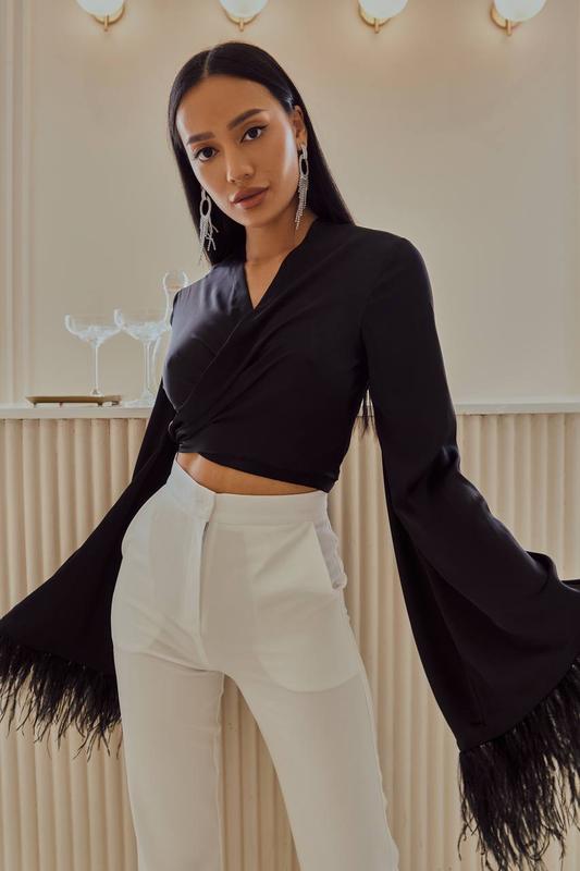 Блуза с перьями Арт 345 Расцветки -чёрный , молочный Размеры -xs-s,m-l Ткань -плотный шёлк Armani Фурнитура -премиум перо Длина изделия 41-42 см , длина рукава 62 +перо