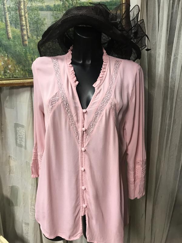 Красивая и качественная блуза от Rosebud. Бирка с составом срезана, но по тактильным ощущениям-это очень качественная вискоза, а возможно и шёлк(очень приятная и комфортная к телу. ). Красива модель:спереди ряд пуговичек обтянутых тканью , застёгиваются на воздушные петли, рукава и передняя пол-очка украшены красивым натуральным кружевом в тон. Размер по бирке -46. Замеры: длина-71 см, ПОГ-53 см, ПОБ-54см, рукав-3/4. Есть незначительное пятнышко(см. Последнее фото)-учтено в цене изделия. В целом-очень красивая .