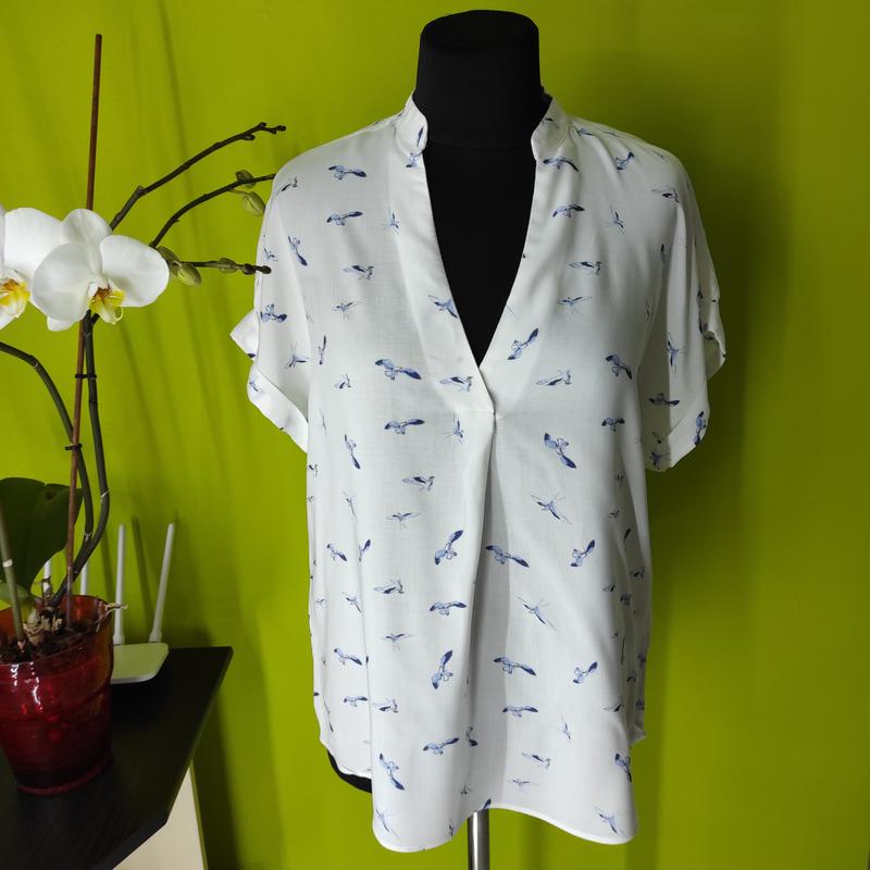 Повністю нова блуза із віскози. Принт птахи на білому фоні. Розмір L/ довжина-67см, ПОГ-54см, плечі-вільні.