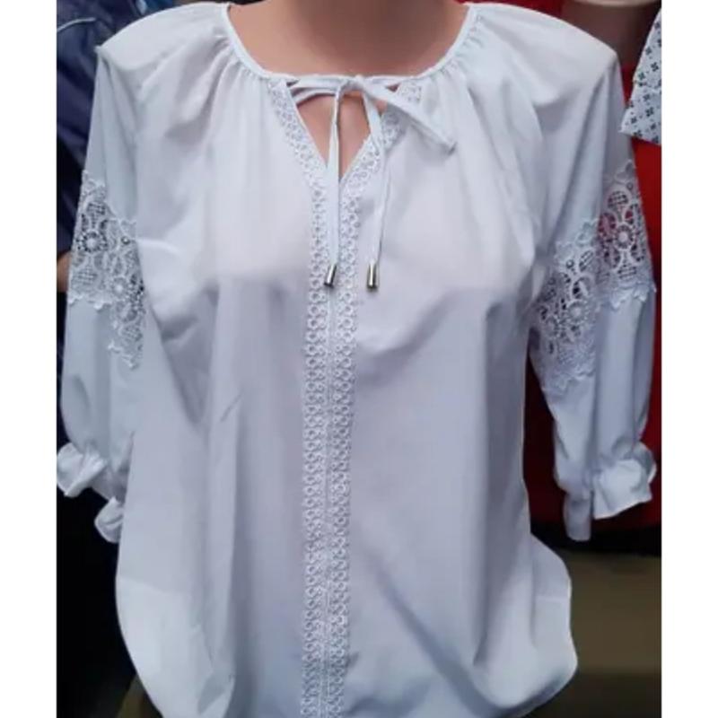 Блуза жіноча вільного крою з гіпюром на рукавах і зав'язками біля горловини. Розміри: 46, 48, 50, 52.
