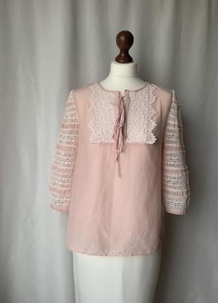 Блуза в пудровом цвете с шикарнейшим составом ( 65% шёлк ) от бренда премиум класса в состоянии новой. Смотрится очень красиво и нежно. Размер указан 40, подойдёт на С/М