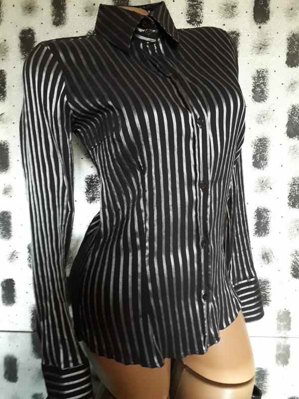Стильная стрейчевая рубашка. Цвет темный коричневый(как черный) в серебряную полоску(не люрекс).Пуговички с логотипом. Очень классно смотрится. Замеры в спокойном состоянии: Плечи 38+ Пог 41+ Высота 62. Возврата нет. Оплата на карту. Новая почта,укрпочта.
