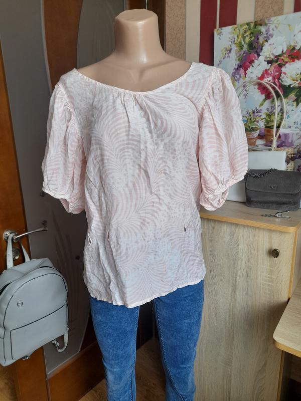 нежная и легкая рубашка, рукава воланами, по бирке размер 10, но ориентируйтесь по замерам ОГ 47 см, длина 65 см