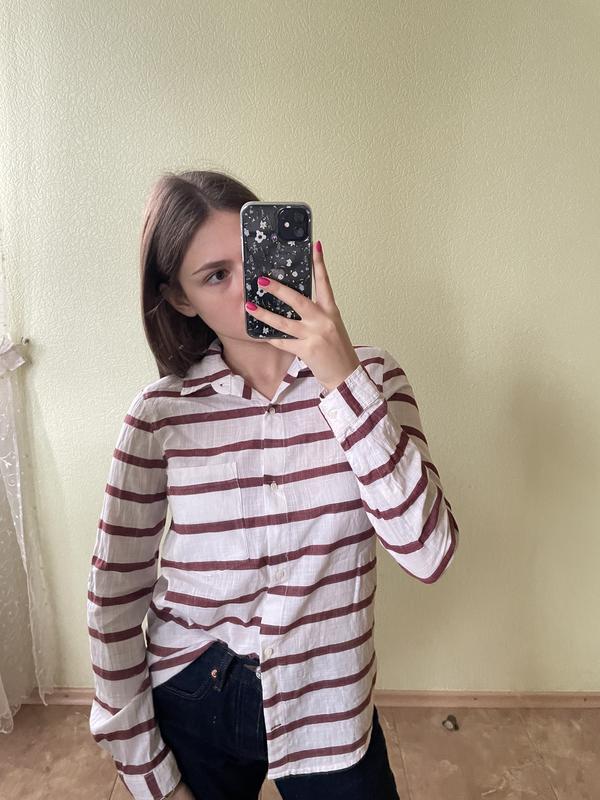 Рубашка в полоску з цупкої тканини,на рукавах є ґудзики