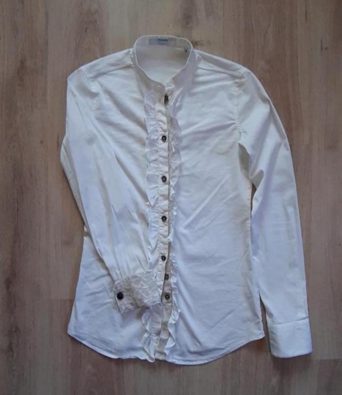 "Aglini" бренд індивідуального пошиття, "shirtmakers". Сорочка білого кольору, приталеного фасону, дуже стильна. Склад: бавовна, стрейч. Бирка зі складом відсутня. Манжети рукавів і бейка для гудзиків облямовані гіпюром бежевого відтінку. Комір стійка, оздоблений натуральним хутром, хутро при бажанні відстібається. 📍товар відправляється при часткової або повної оплати на картку. ☆☆☆☆☆☆☆ пог 43см. піт 36см. побіди 42см. рукав 60см. (без підвороту) рукав 54см. ( з підворотом) довжина 67см. воріт 36см.