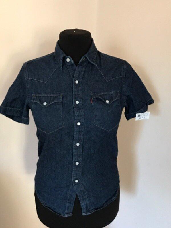 Джинсова сорочка з 100% котону, розмір ХС, можна і на С, дивіться заміри. Довжина - 65см, плечі- 40см, рукав-21см, пог- 49см, пот-48см, поб-49см.