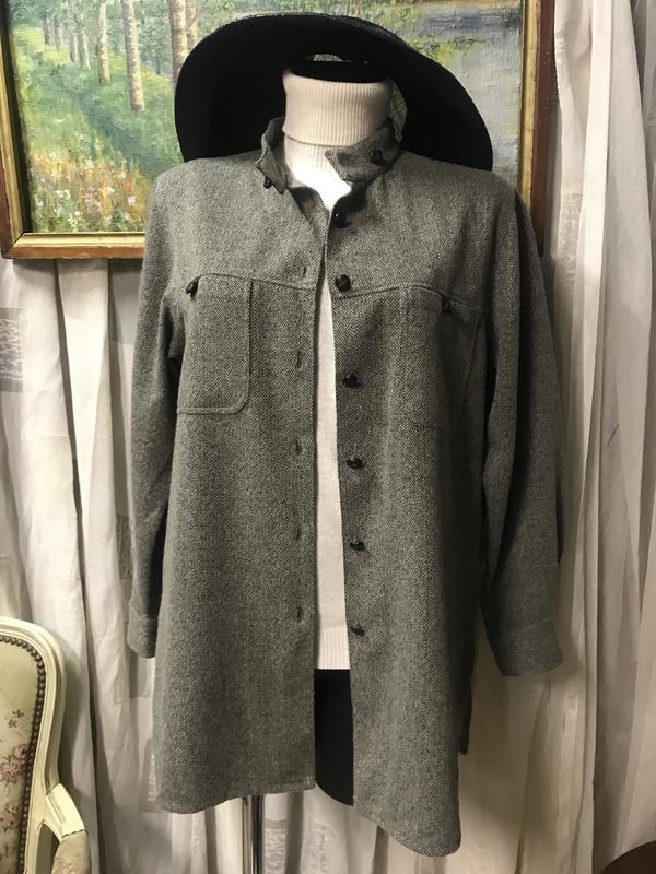 Стильная женская рубашка прямого силуэта. Узор-«елочка». По бокам разрезы, ворот-стоечка на пуговице, два накладных кармана на груди, рукав на манжете с пуговицей. Можно носить в разных вариантах,. Состав:шерсть/полиэстер(40/60). Размер по бирке-L. Замеры: длина-76 см, ПОГ-53 см, ПОБ-54 см, рукав-59 см.