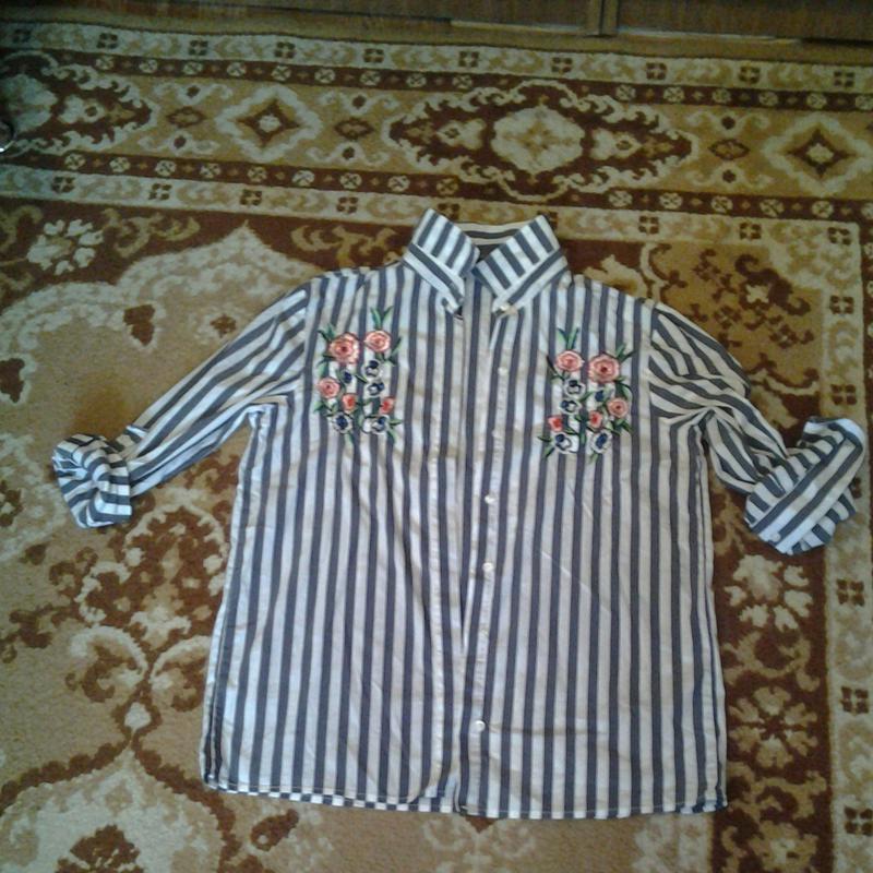 Виробництво Туреччина . Актуальна сорочка в смужку з вишивкою . Довжина від коміра до низу 72см, без коміра 66см. Під пахвами 50см . Довжина рукава 55см, рукав підвертається на хлястик . Плечі 40см. Стан нової речі, тобто була одягнена один раз.
