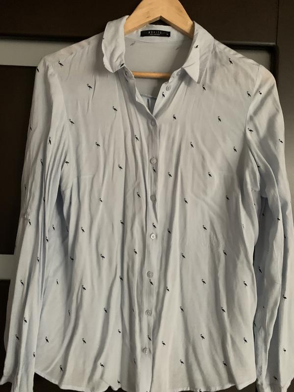 Рубашка нежно голубого цвета с маленькими птичками Размер на с-м Состояние красивое Думаете со не постиранная, это чуточку портит ее вид