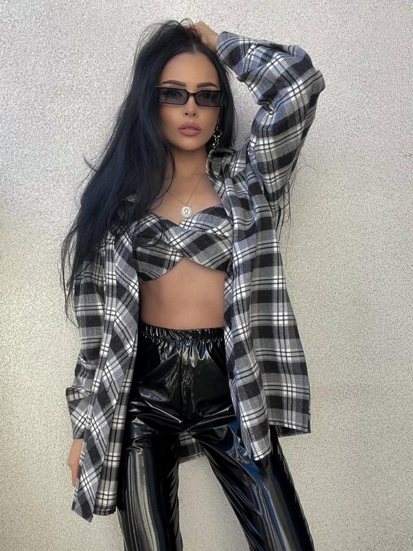 Комплект рубашка и топ Реал фото Мод 2016 Ткань клетка трикотаж турецкий Цвет черно-серый Размер 42-44,44-46 Цена 680 грн #комплект #рубашка #топ #клетка #серый #чёрный #brand_388