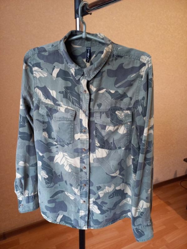 рубашка в интересный принт, не теплая, типа коттон. Указан размер s, но может быть и на m,L., пог.51см., длина 61см., рукав от шва 59см.