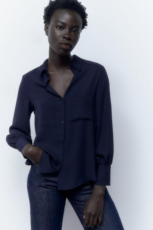 Рубашка с отложным воротником, V-образным вырезом и длинными рукавами. Передние накладные карманы. Застежка спереди на кнопки. Замеры: Плечи 34 ПОГ 48 Длина 65 Рукав 58/41 Нова но без етикетки