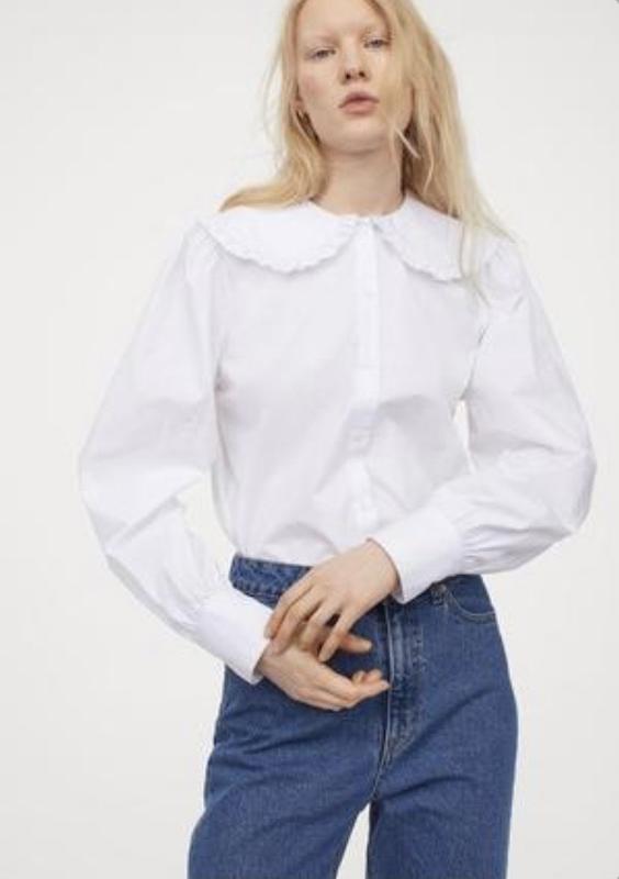 Прямая блузка из воздушной хлопчатобумажной ткани. Модель с большим двойным воротником, увенчанная небольшим взъерошенным краем и передней пуговицей. Длинные рукава с широким запястьем на пуговицах. Закругленное основание с немного большей длиной сзади Товар неношен од примерок некоторие вещи стирани