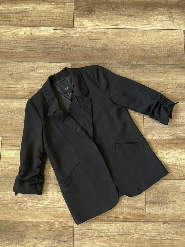 Чорний піджак з легкої тканини в ідеальному стані без дефектів. Присутні кармани. Без застібок, рукав укорочений. Заміри запитуйте у дірект🫶🏼 Розмір С