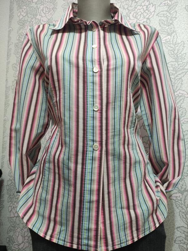 Италия бренд рубашка-рубашка. 70%котон. Шикарная вещь. Состояние новой вещи Размер около 48 Замеры: -----длина 63 -----рукав 64.5 -----плечи 43 -----ОГ 106 -----ОТ 94