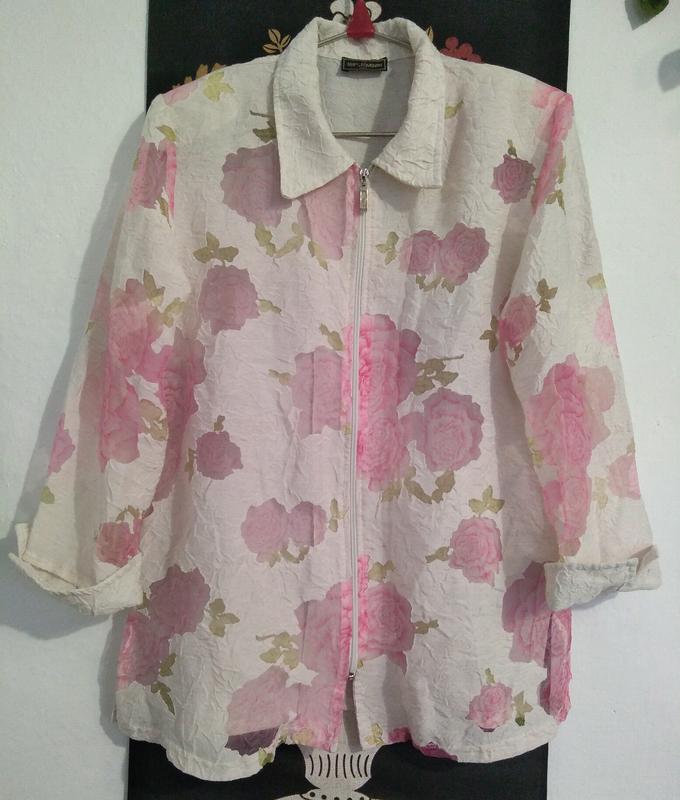 Шикарная рубашка - жакет из жатой натуральной ткани, не требует глажки. Сделано с умом, так как вискозе и льна свойственно помяться. Цветки из полиэстра, они прозрачные. Основная ткань - вискоза и лен. Можно носить как основную вещь, да как второй ярус. Длина 76 Пог 60 Рукав 60 По плеч 44