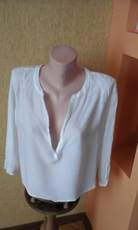 Белая рубашка размер - М, длинна - 50 см., ПОГ - 50 см., длинна рукава от плеча - 45 см. Состав ткань жатка вискоза. На лето очень приятное к телу можно под брюки или юбку.