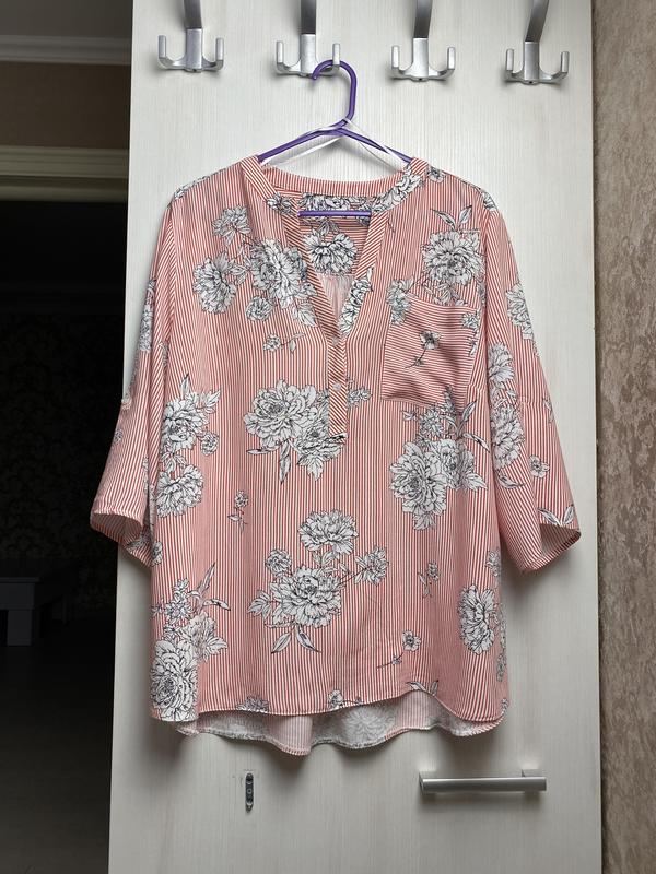 Блузка-рубашка с укороченным рукавом в полоску и цветочным принтом, натуральная ткань