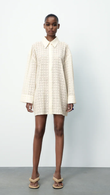 Рубашка оверсайз блузой-туникой с вышивкой ришелье ZARA Очень роскошная рубашка с вышивкой в бежевом цвете. 80% полиэстер, 20% хлопок. Вышивка 100% хлопок. Рубашка оверсайз с воротником и длинными рукавами с манжетами,вышивка ришелье и застежка на пуговицы спереди. Р. М по бирке Блузой садится и на ХЛ Очень большемерит Плечи 58 Пог 62 длина 70 длина рукава 50