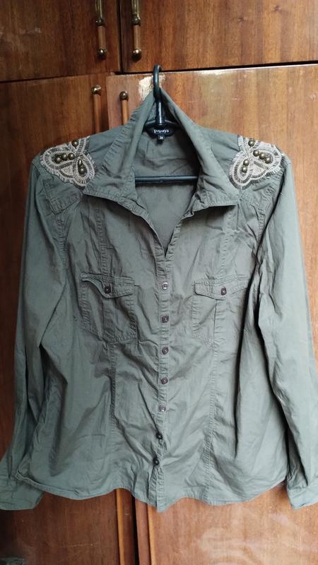Сорочка хакі з аплікацією на плечах і накладними кишенями. Довжина 67 см, рукав 65 см, плечі 43 см, пог 59 см.