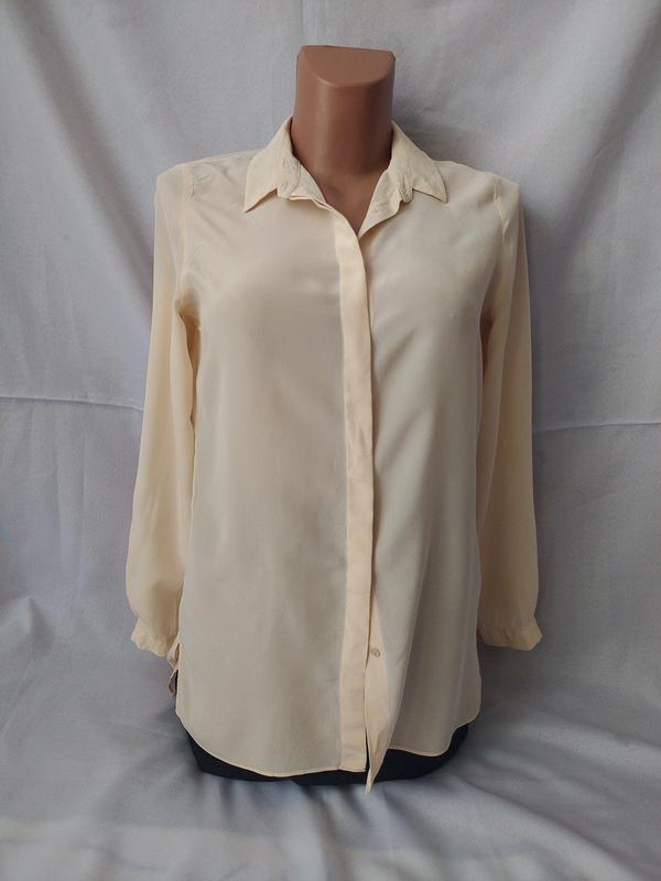 Шелковая рубашка с длинным рукавом. Спинка немного длиннее, чем перед. Замеры: ширина в плечах 36см, пог 49см, длина 73см, рукав 57см.