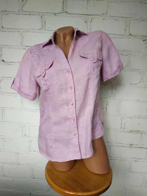 Лляна сорочка з вишивкою бузкового кольору, не тонка. Довжина від плеча 55-58 см (півколо), Пог 50 см, Пот 46 см, плечі 40 см, рукав від плеча 20 см. 100% передплата на картку, доставка за рахунок покупця