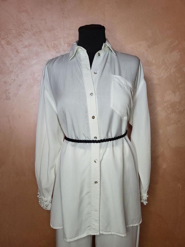 Удлиненная белоснежная рубашка с жемчужинами на воротнике и манжетах.До джинсов именно то что нужно каждой девочке.Замеры задайте, идет в качестве оверсайза.