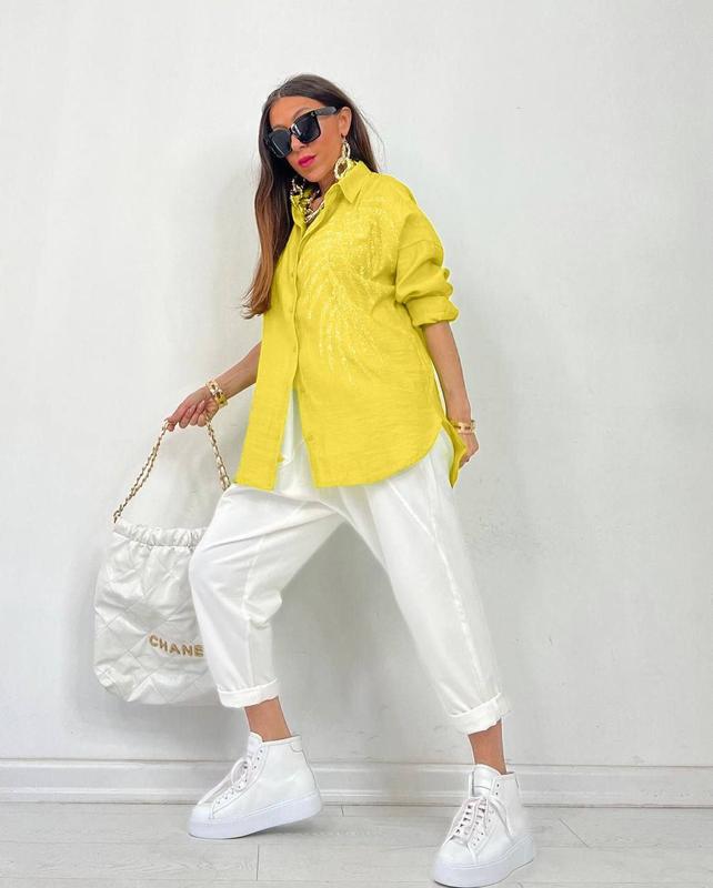Сорочка арт. *** 1007 Размеры: 50-54, 56-60 Цвет: черный, синий, оранжевый, розовый, желтый Ткань: мягкий жатый лён Стильная рубашка свободного кроя, позволяющая носить ее как отдельный elемент одежды, так и вторым слоем поверх футболки или топа. Мягкая приятная натуральная ткань. Полноценный длинный рукав. Качественный накат - перо. 📩 @****************
