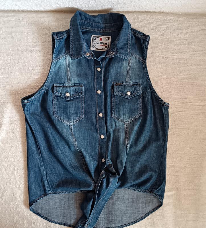 Модная джинсовая рубашка р.S.Подойдет на девочку подростка или худи маму. Цвет реальный фото, красиво смотрится, на кнопках,е карманы.Замеры на фото. Пересылка по Новой почте, Укр-почтению.