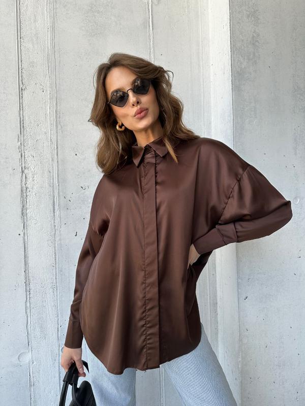 Сорочка арт. ryab. 522 Ткань: шелк "Армани" Размер: 42-46 универсальный Цвета: белый, голубой, черный, шоколад, светлый капучино Базовая рубашка - незаменимая вещь в гардеробе. Качественная и приятная к телу ткань, пуговицы скрыты, нереально красивые и нежные цвета. Элегантная и романтическая одновременно.
