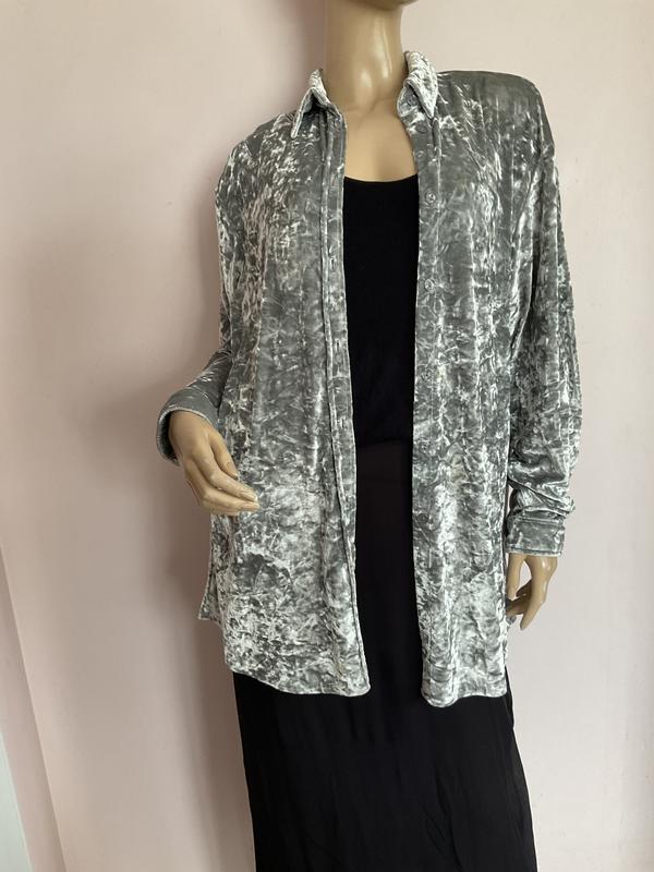 Серебристая брючина, мягкая, средняя. Тянется. Без дефектов. Замеры в груди 58 см в бедрах 55 см длина 80 см рукав 59 см от горловины 79 см в плечах 50 см 26:7:23