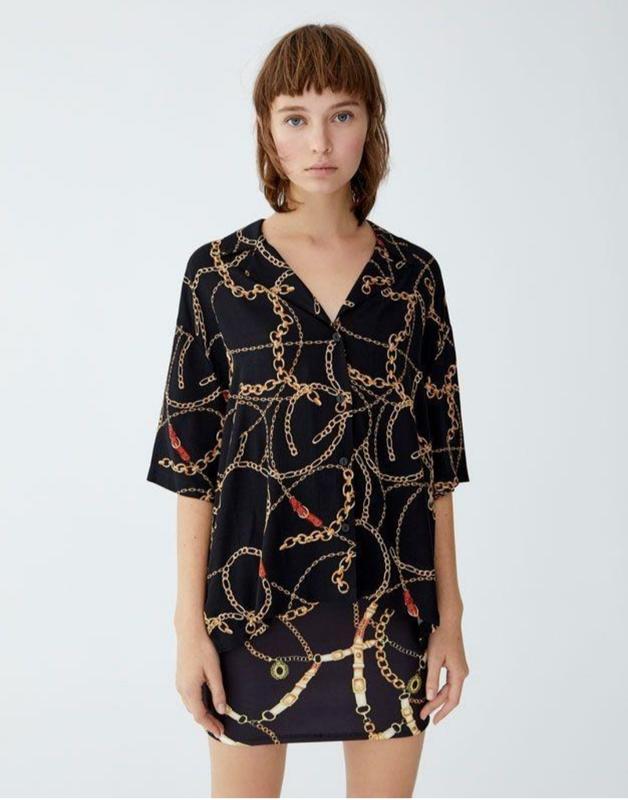 рубашка pull & bear, размер L, сделано в Марокко, ткань вискоза, принт цепые, цвет черный, состояние очень хорошее. Лежит, не 47. Длина изделия по спинке 60, перед 54, ПОГ 56 ПОТ 57, длина рукава 25, по бокам разрезы по 9 см.