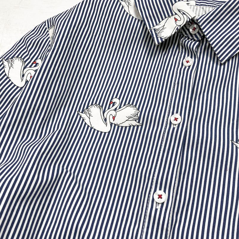 Роскошная рубашка в полосочку темно-синего цвета стильным принтом лебедями