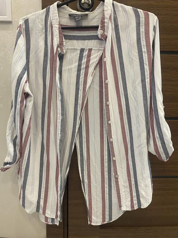 Сорочка в смужку, рукава 3/4, підкочуються, ззаду цікавий розріз. Бірка зі складом зрізана, але тканина легка.