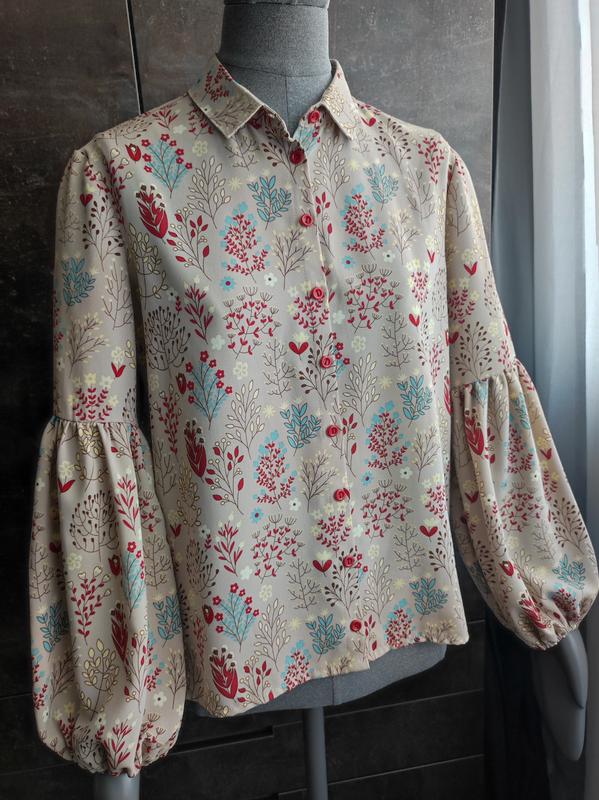 Рубашка в идеальном состоянии, растительный принт, красные пуговицы, рукава фонарики, снизу на резинке.