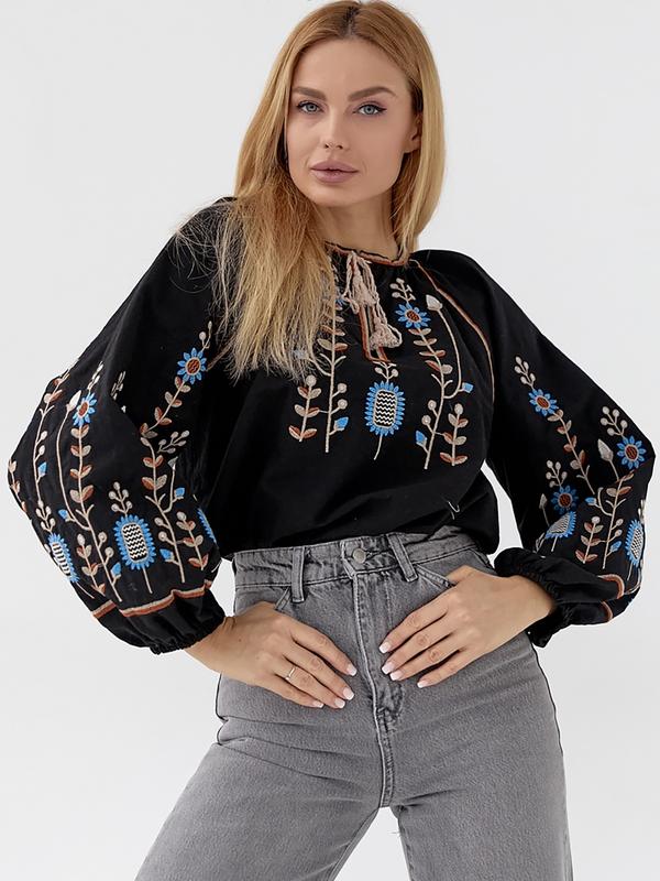 💛Хлопковая вышиванка прямого кроя. Выполнена из высококачественного материала. Модель с V-образным вырезом на завязках с кисточками. Длинные рукава реглан с манжетами на резинке. Полка и рукава декорированы цветочной вышивкой. ✔Размер универсальный:44-46⤵️ Объем груди:108см длина изделия - 61 см длина рукава - 67 см. 🧵Состав: 80% хлопок, 20% полиэстер 🌈Цвет: черный 🧵Материал: Бавовна 💳Цена: 1350грн Арт90237 ‼️Количество ограничено!!️