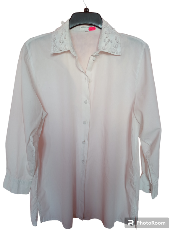 Белая блуза, сможете быть оверсайз, индивидуален двуъемный воротник,верх с нарядным кружком.Бренд "MARCO VISCONTI". Рукав-59см,плечи-43см,грудь-61см,длина-79см.