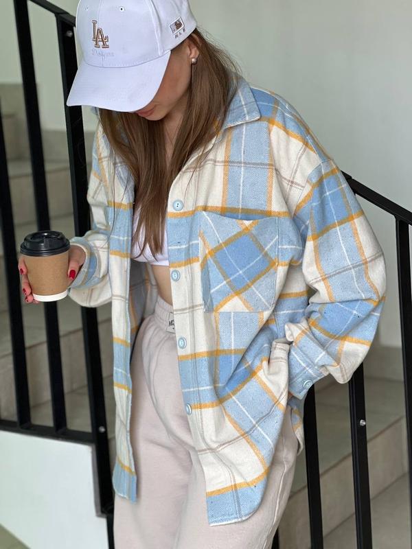 Теплая осень кашемировая рубашка в клетку белая голубая