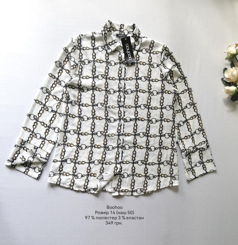 Рубашка от Boohoo. Размер 14 (наш 50). Состав 97% полиэстер 3 % эластан. Замеры : длина по спинке 68 см, ПОГ 52 см, ПОТ 51 см, ПОБ 56 см, плечо 12 см, длина рукава 60 см. Стан новая с бирками.